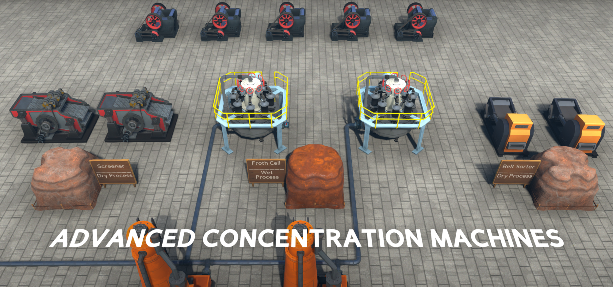 In this screenshot you can see an array of mid and end-game mineral processing technology: [Jaw Crushers] for crushing along the top, [Screening Machines], and [Sensor-based Belt Sorters] for dry concentration of iron ore, and [Froth Floatation Cells] for wet processing of all ore types in the middle. On the bottom you can see the tops of [Blast Furnaces], currently our mid and end game smelters.