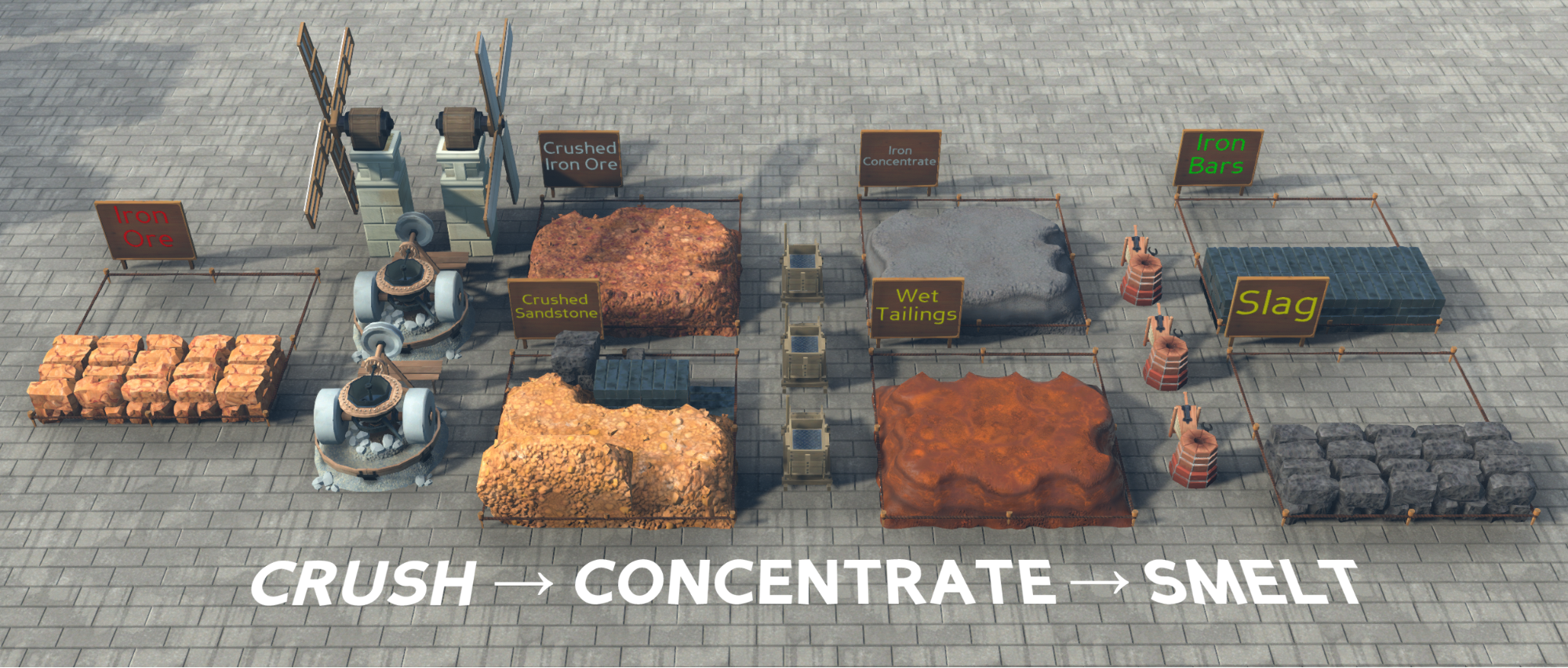 From left to right, [Iron Ore] embedded in sandstone from a mine goes through the [Arrastra] which crushes it, producing [Crushed Iron Ore] with [Crushed Sandstone] as a new byproduct. The [Crushed Iron Ore] can then be poured through a [Rocker Box] to concentrate it into [Iron Concentrate], with [Wet Tailings] coming out as a new byproduct. [Iron Concentrate] can then be smelted into [Iron Bars], with [Slag] as a new byproduct.