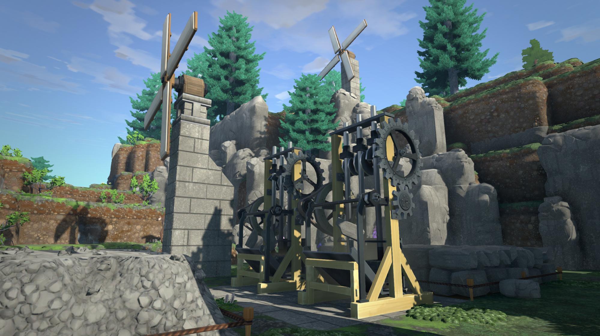 [Stamp Mills] are an early upgrade to the [Arrastra] crusher, allowing more efficient and timely crushing of rock and ore. Here, two of them are going through a stockpile of [Granite] to make [Crushed Granite], harnessing the power of the nearby [Windmills].