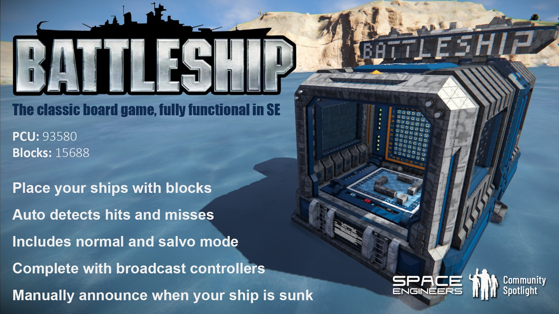 ![]() | Battleship by AeQuArTzThe classic board game "Battleship" made fully functional in vanilla Space Engineers with block coding! This game is made possible with 1067 timers, 55 events, 15 broadcast controllers, 2 active hinges, 400 projectors, 200 sensors, and 216 buttons. |