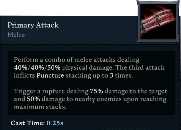 The puncture mechanic is outlined here. This is a stacking effect, mimicking the act of rending and debilitating your foe more as you continue to tear into them. When the effect ‘pops’ it causes a chaotic explosion of damage dependent on how many stacks have built up on your foe. A messy conclusion worthy of the weapons.