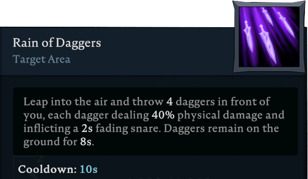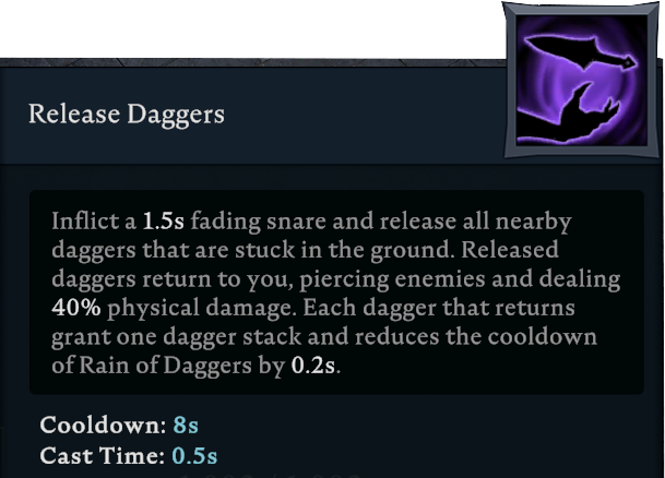 Snap out these throwing blades one after another, sinking them into your foe and littering the ground with discarded knives. Then, harness your magic, drawing them back to you and tearing through any opponents between you and your masterfully laid trap.